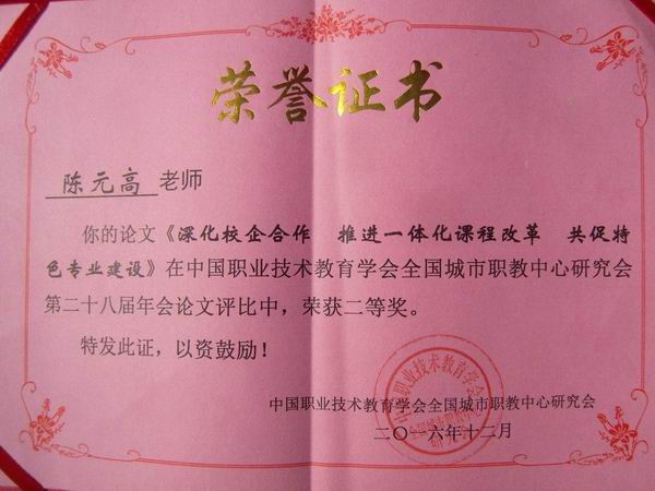 本届年会还举行了论文评选,年会组委会收到了论文50余篇,共评出了一等奖论文3篇,二等奖论文6篇,三等奖论文9篇。陈元高的论文《深化校企合作 推进一体化课程改革 共促特色专业建设》荣获二等奖。闭幕式上,张国方宣布了论文获奖名单,举行了颁奖仪式。年会副理事长、北京市实美职业学校书记廖爽作了年会总结。会议期间,陈元高与各兄弟学校校长进行了广泛交流,结交了朋友,扩大了影响,获益良多。