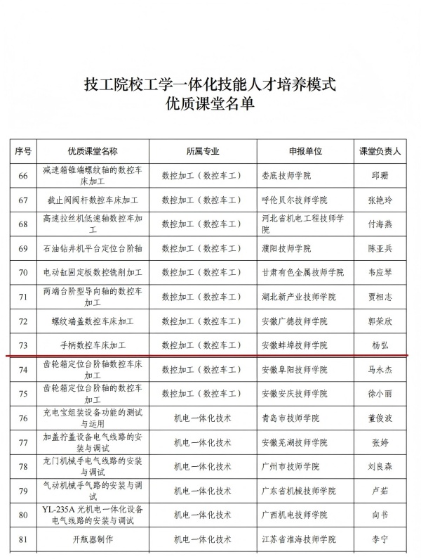 近日,人力资源和社会保障部办公厅正式公布技工院校工学一体化技能人才培养模式优质课堂第一批遴选名单,我院机械工程系杨弘老师主讲的《数控加工(数控车工)——手柄数控车床加工》成功入选,是我市唯一入选的参评课程。
