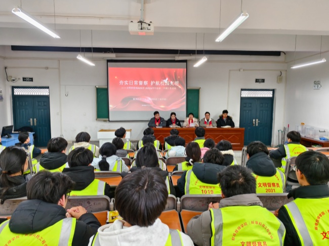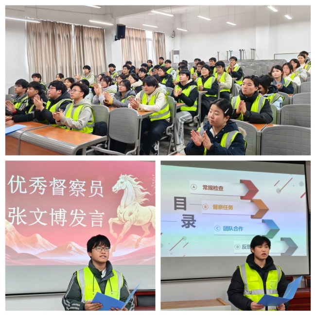 为全面总结本学期校园文明建设与日常管理工作,表彰先进,我院文明督察部于2026年1月9日中午,在4号楼207阶梯教室隆重召开了期末工作总结暨表彰大会。学生处和文明督察部全体成员出席会议。会议由学生处汤瑶池老师主持。